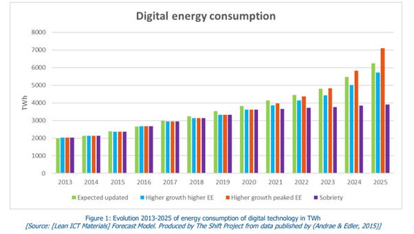 - An explosion if progress in energy efficiency slows down. However, this risk is real because current technologies are approaching their limits and future technologies (quantum processors for example) will not be industrialised by this deadline. Under these conditions, an E-ratio of 6% in 2025 is likely.